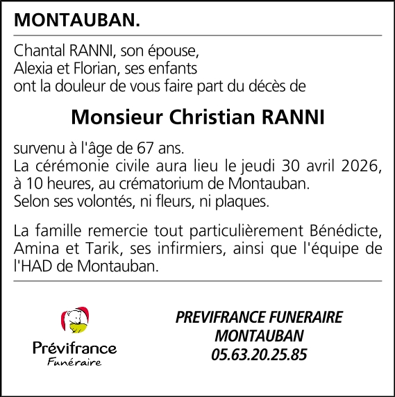 Avis de décès de Monsieur Christian RANNI