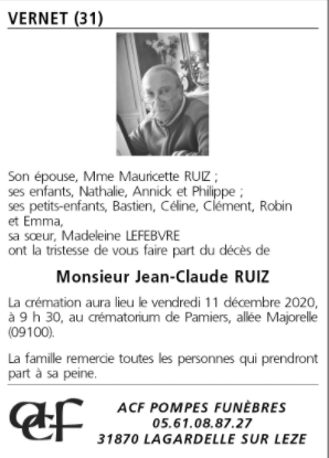 Décédé à Lagardelle-sur-Lèze (31870, France) le dimanche 6 décembre 2020 à l'âge de 76 ans