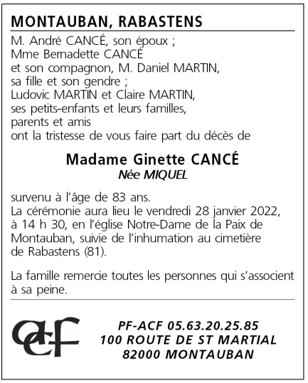 Décédée à Montauban (82000, France) le mardi 25 janvier 2022 à l'âge de 83 ans