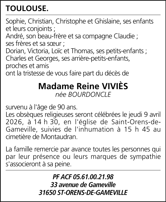 Décédée à Toulouse (31400, France) le jeudi 2 avril 2026 à l'âge de 90 ans