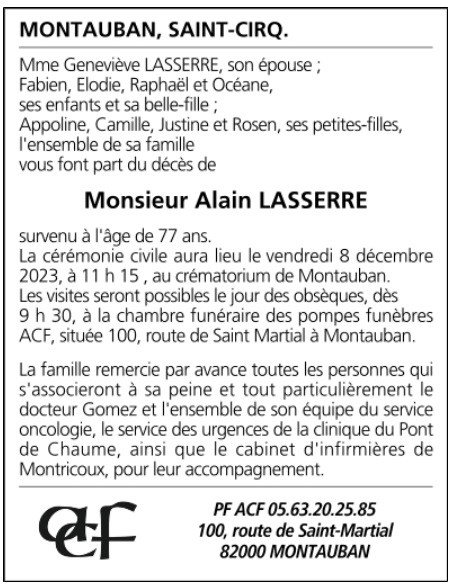 Avis de décès Monsieur Alain LASSERRE
