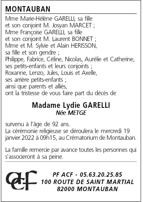 Avis de décès Mme GARELLI Lydie