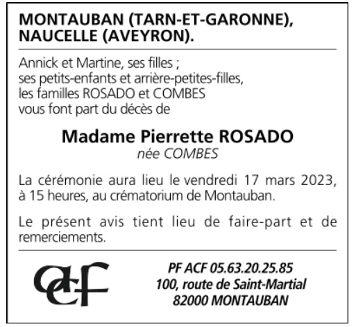 Décédée à Montauban (82000, France) le samedi 11 mars 2023 à l'âge de 90 ans