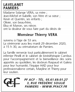 Décédé à Pamiers (09100, France) le jeudi 24 décembre 2020 à l'âge de 53 ans