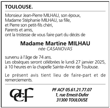 Décédée à Toulouse (31400, France) le mercredi 15 janvier 2025 à l'âge de 74 ans